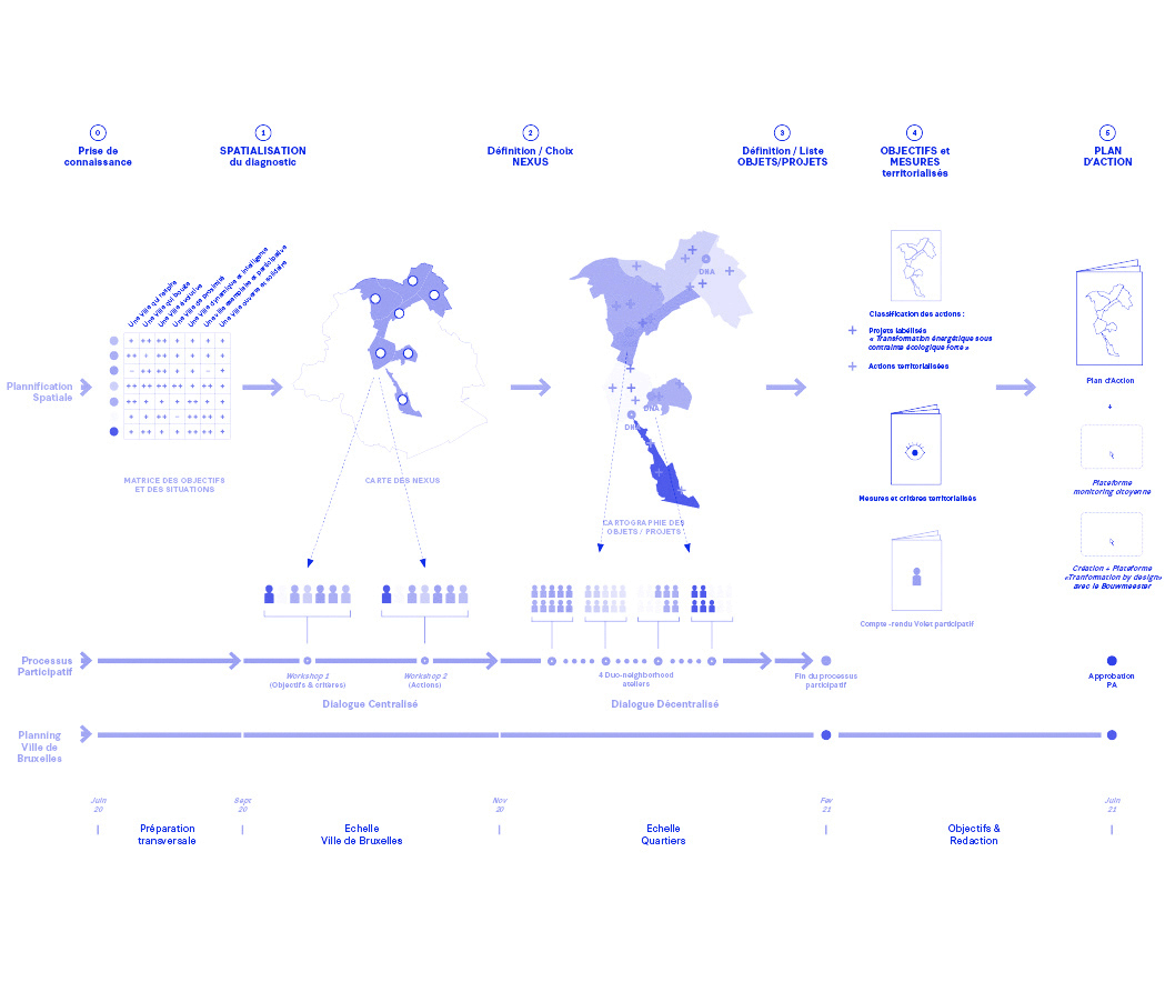 Together with l'AUC (Paris), experts in urban metabolism Aristide Athanassiadis (Metabolism of Cities) and Stephan Kampelmann (ULB), and OFFICE KGDVS, a plan was drawn up with spatial actions clustered in 'nexuses' linked to a live monitoring of ambitious and supported objectives.